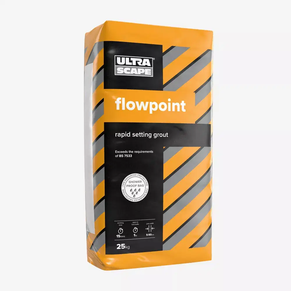 UltraScape flowpoint fine is a rapid set grout with high fluid consistency for early trafficking that conforms to the strict demands of BS 7533. It is ideal for all paving areas where a rigid or bound void-free joint is required. The product is suitable for application on driveways, patios, town centre pedestrian schemes, pathways and carriageways. UltraScape flowpoint fine can be used with natural stone, concrete flags, Porcelain tiles and clay pavers.